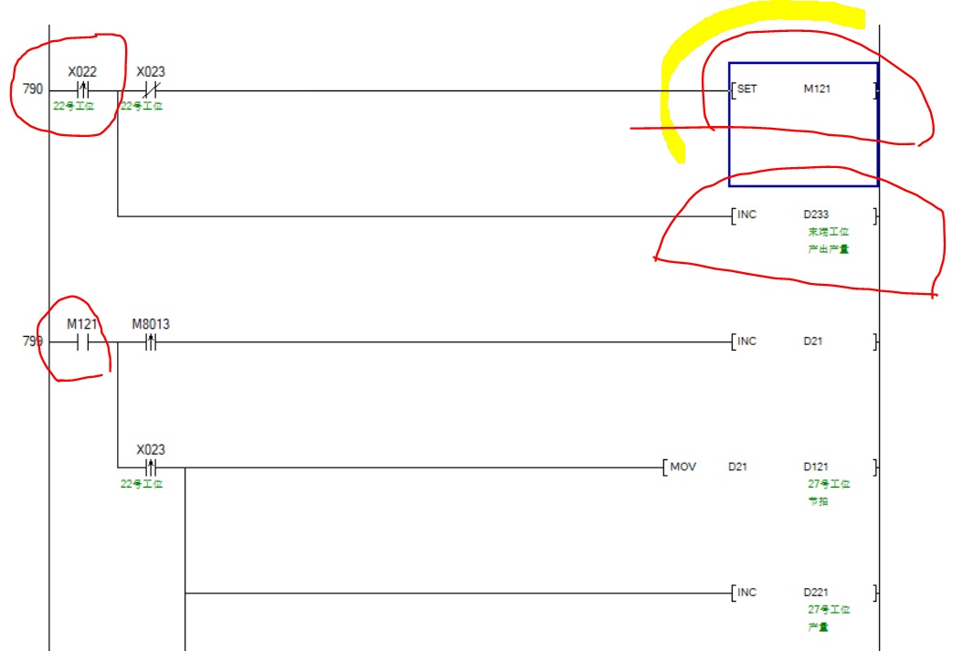 可能X022和X023同時有信號,此時D233加1的條件滿座。M121動作的條件不滿足