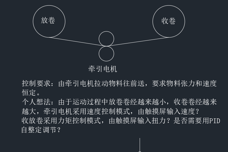最近在做一個項目,有點類似上圖中的控制方式,但是實際中是有很多軸的,沒有任何緩存擺棍的機構。我只畫了主要思路的部分,請各位看看覺得可行嗎?沒接觸過張力控制這塊。
