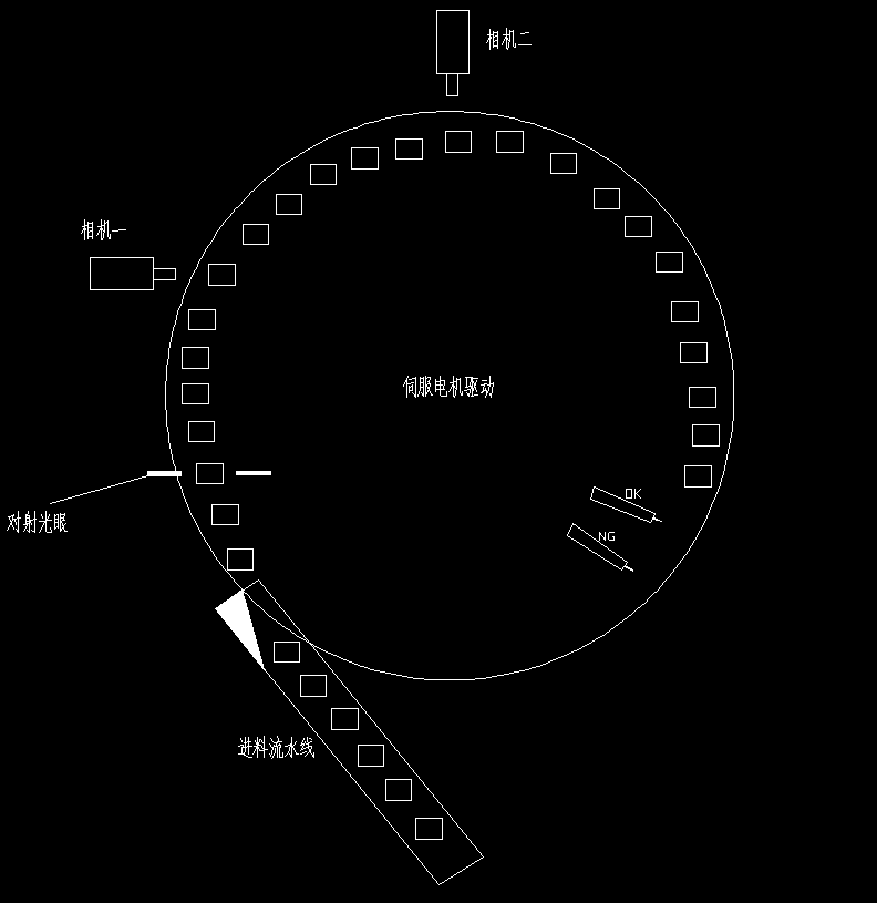 流程如下:啟動后傳送帶持續送料至圓盤,伺服驅動圓盤勻速轉動,物料間隔隨機,必須兩組相機都判定合格才算OK,否則算NG。