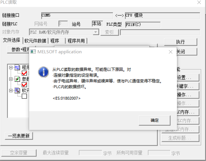 大家好,請教大神幫個忙看看到底是怎么回事。知道的告知一聲。我手頭有個國產(chǎn)的PLC板我用PL2303串口線讀取程序時提示:從PLC讀取的數(shù)據(jù)異常,可能是以下原因。對連接對象指定的設(shè)定有勿。由于電纜異常,硬件異;蛟胍舻龋古cPLC通訊變得不穩(wěn)定。PLC內(nèi)部損壞!禘S:01802007》   我重新買了一條線還是這樣,設(shè)置各種波特率都沒有用。知道的大神望告知一下在此先謝謝。