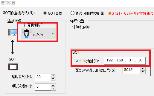 使用以太灌程序時,軟件“通訊\通訊設置\計算機側I/F”要改成以太網