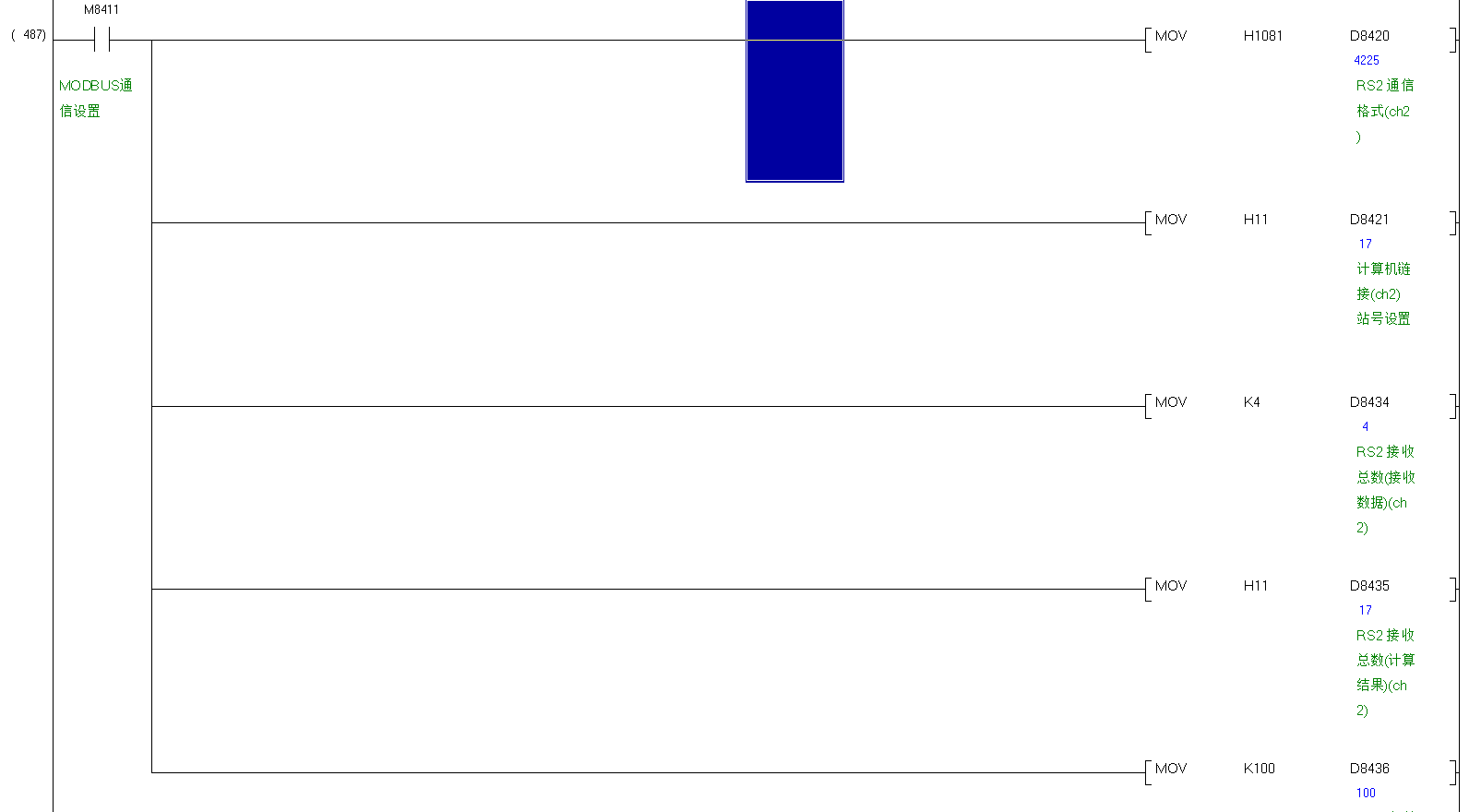 現在的接法是通過一個232轉485轉接器接到電腦上,RDA短接接SDA接轉接器的485+,RDB短接SDB接轉接器的485-,然后在PLC的Main程序里加了這段,把PLC作為從站。