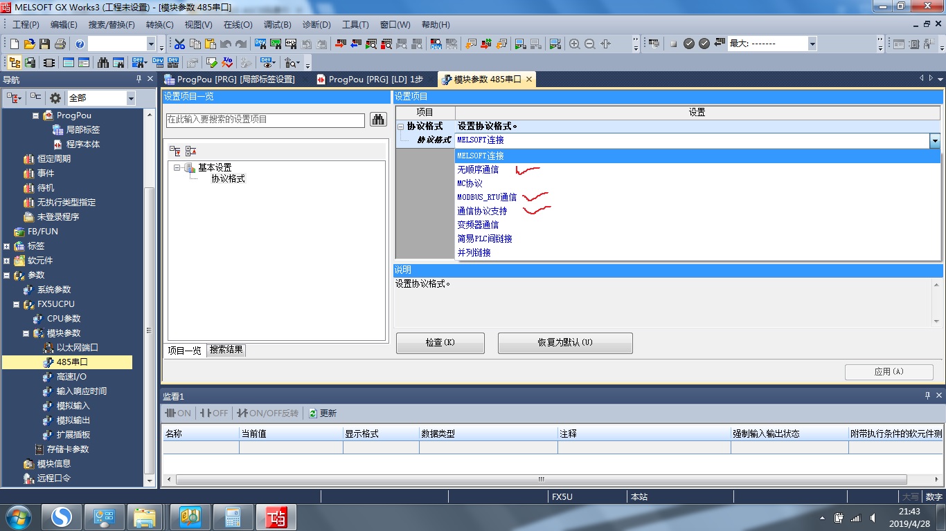 描述:FX5U MODUBUS RTU 自帶方式