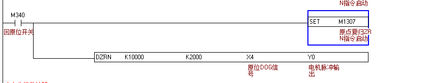 原點復歸ZRN指令啟動負向極限開關功能(M1307),要在回原指令前先置位此軟原件,我用的是ES2系列的通道一,至于你 EH系列是不是同樣的軟原件就要看手冊了