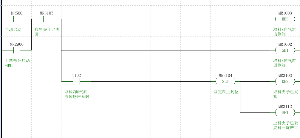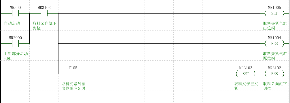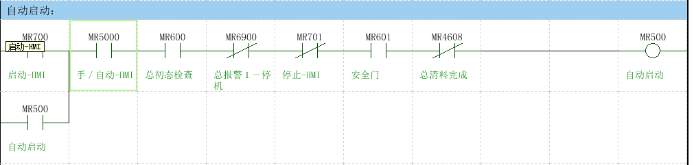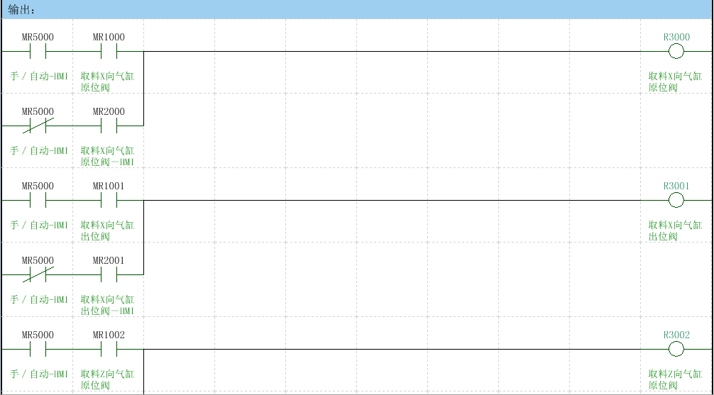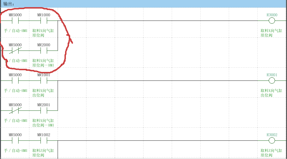 假設(shè)你的是單電控的電測閥,如圖所示,當(dāng)MR5000為ON, MR1000為ON, 則R3000為ON有輸出,如果此時(shí)我需要手動(dòng)自動(dòng)切換時(shí),當(dāng)我按下手動(dòng)自動(dòng)切換按鈕,MR5000為OFF的時(shí)候R3000就OFF了,氣缸就返回了,根本就沒有去按手動(dòng)的必要了。