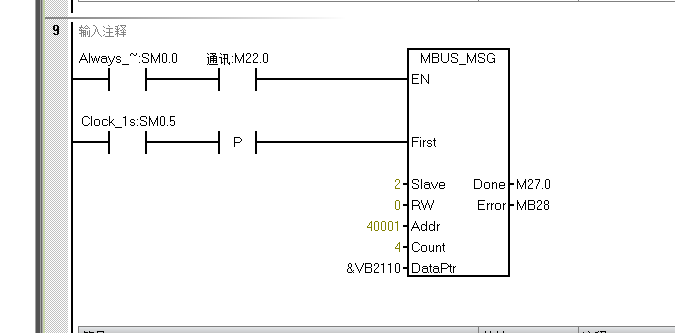 你這個(gè)程序是從2號(hào)站讀回4個(gè)字,讀回的數(shù)據(jù)放在以地址VB2110字節(jié)開(kāi)始的存儲(chǔ)區(qū)中。從你的程序看,2號(hào)站點(diǎn)中40001中的數(shù)據(jù)存到S7-200PLC的VW2110中、2號(hào)站點(diǎn)中40002的數(shù)據(jù)存放到PLC的VW2112中、2號(hào)站點(diǎn)中40003的數(shù)據(jù)存放到PLC的VW2114中、2號(hào)站點(diǎn)中40004的數(shù)據(jù)存放到PLC的VW2116中。