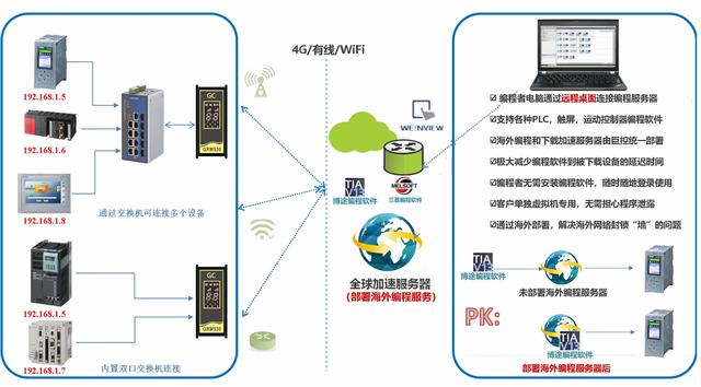此方案也適合客戶在國外地區的設備調試,巨控國內和海外編程云服務器部署,將延遲變成2段,一部分延遲由遠程桌面承擔,一部分延遲由編程軟件到PLC承擔,實現全球任何角落設備的遠程下載調試。