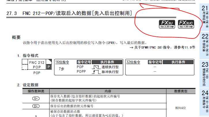 而POP指令僅標注FX3U,表明其僅支持FX3U機型。