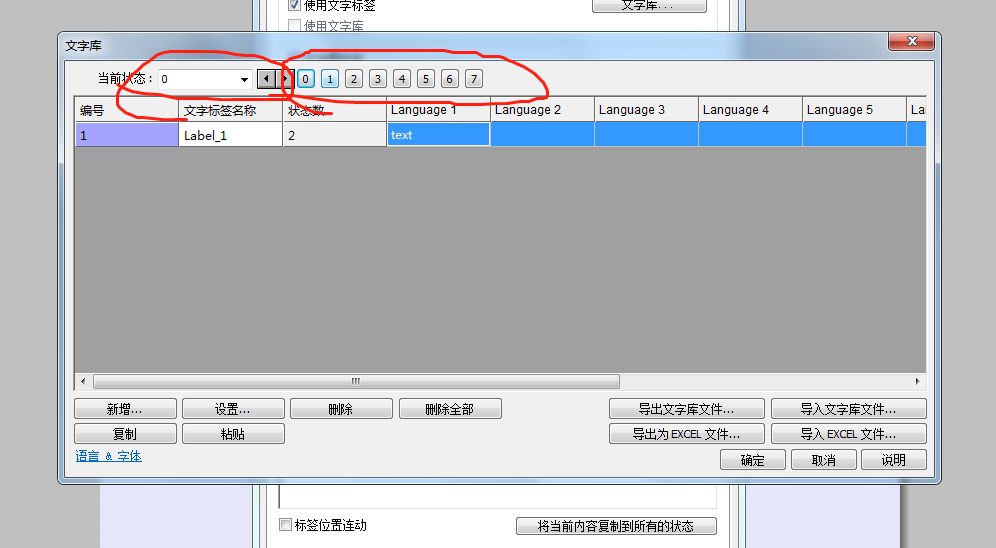 試過點擊狀態“1”后,再選擇“使用文字庫”的“標簽”選擇其它標簽也是不能顯示,請問該怎么做呢?