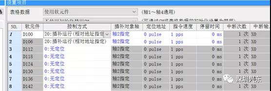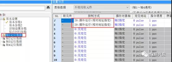 然后設定“軸1定位數據“插補的”軸2定位數據“(以1、2軸插補為例)