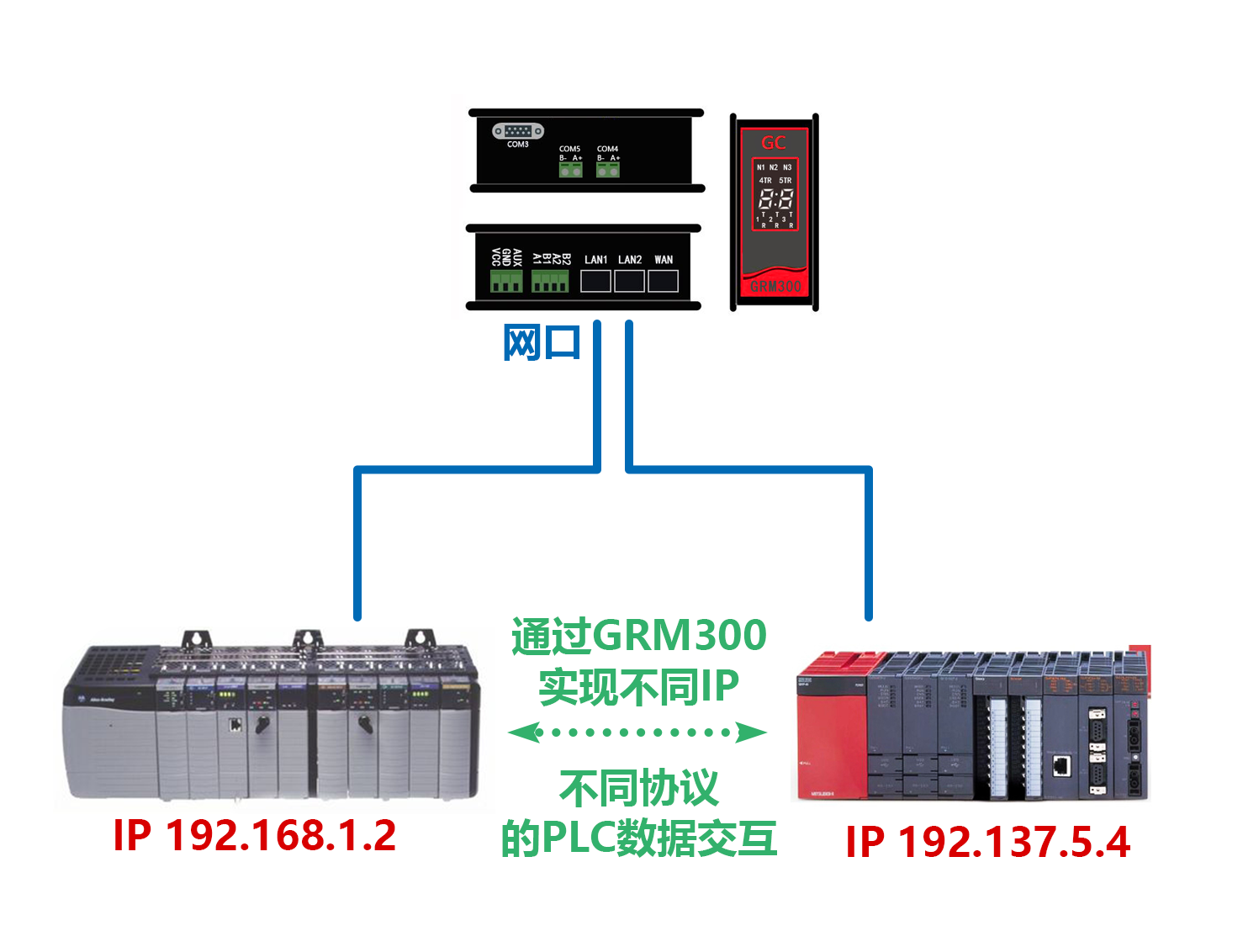 巨控方案:使用GRM300系列網(wǎng)關(guān),2個(gè)網(wǎng)口分別接1756和三菱Q