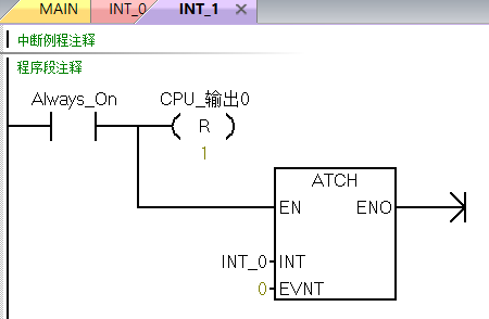 明白了,主要原因是沒搞明白ATCH的作用,ATCH并不是用來調用中斷,而是用來將中斷事件號和中斷程序進行連接,所以在主程序進入中斷程序0后置位Q0.0,并把沿中斷和中斷程序1連接起來,返回主程序;下一次中斷就是進入中斷程序1后復位Q0.0,并把沿中斷和中斷程序0連接起來,返回主程序,以此反復,從而實現一鍵啟停