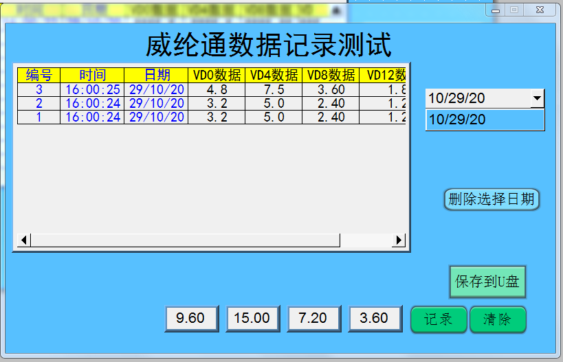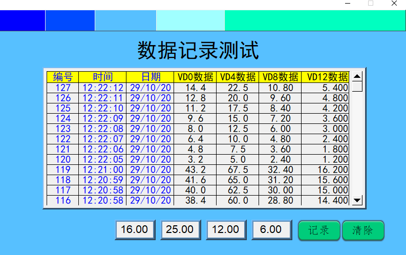 威綸通歷史數據演示,可離線模擬,自動設置10秒更新一次數據 VD0- VD12  float。