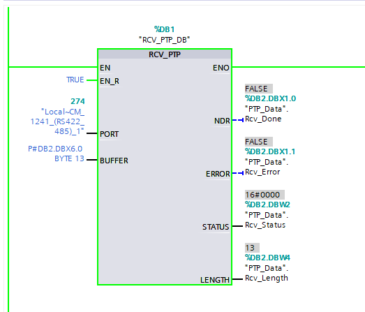 這里還想問下RCV_PTP和Receive_P2P功能塊的區(qū)別,我現(xiàn)在用的是RCV_PTP,說明里說EN_R在上升沿啟用接收,但是我實際發(fā)現(xiàn)一直給TRUE也是可以接收的。我使用Receive_P2P就沒有接收成功過數(shù)據(jù),這是什么原因?