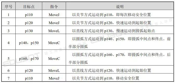 MoveJ、MoveL 和 MoveC 指令的綜合應(yīng)用在進(jìn)行一個(gè)畫圓動(dòng)作時(shí)其路徑如下圖所示,其軌跡見下表。