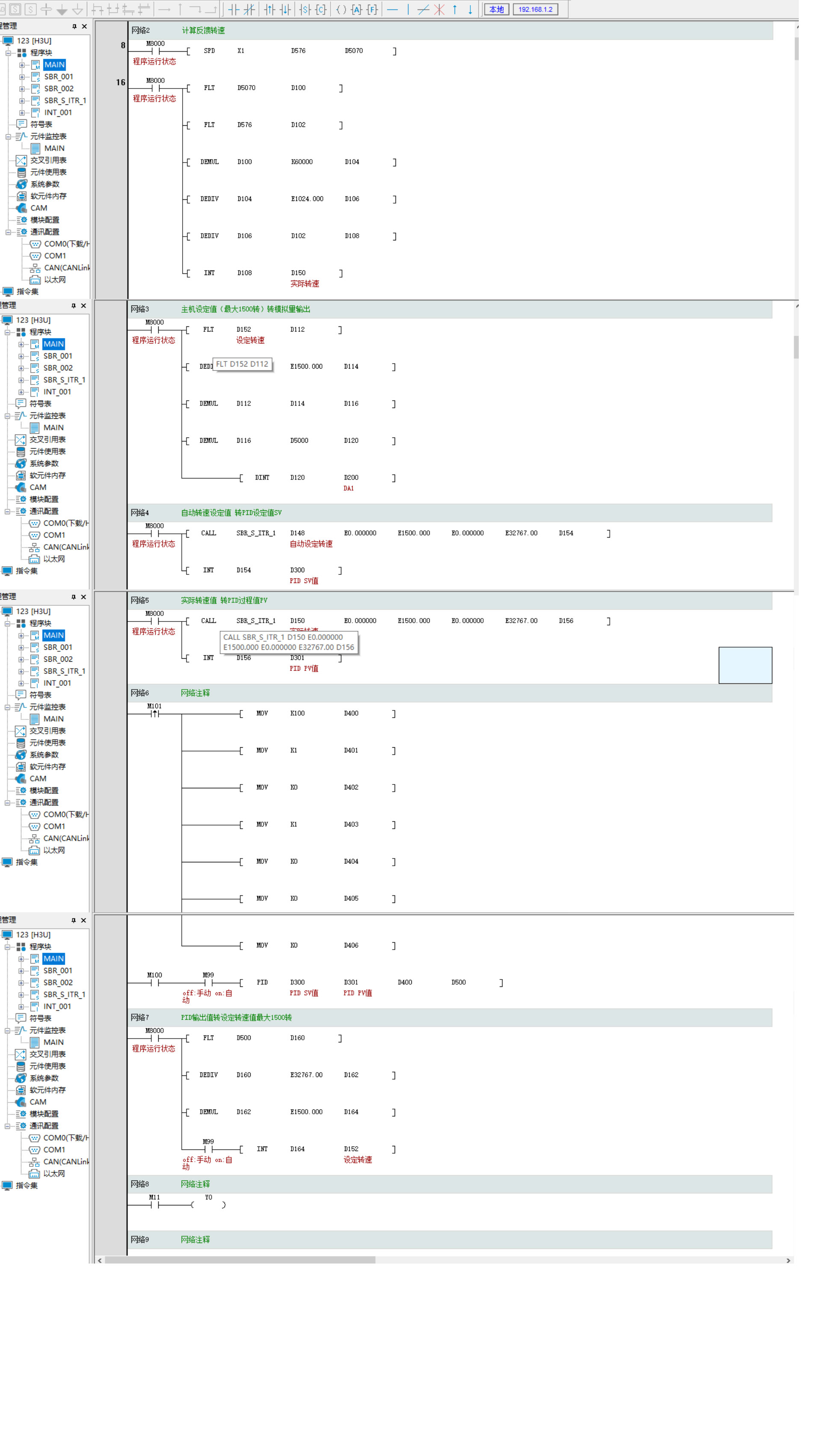 工況說明:變頻器驅動電機轉動,電機加裝編碼器反饋給PLC,做為PID控制器的PV值,與設定值SV(轉速)進行PID運算,輸出控制變頻器,使電機穩定在SV值運行。(匯川3U的PLC)