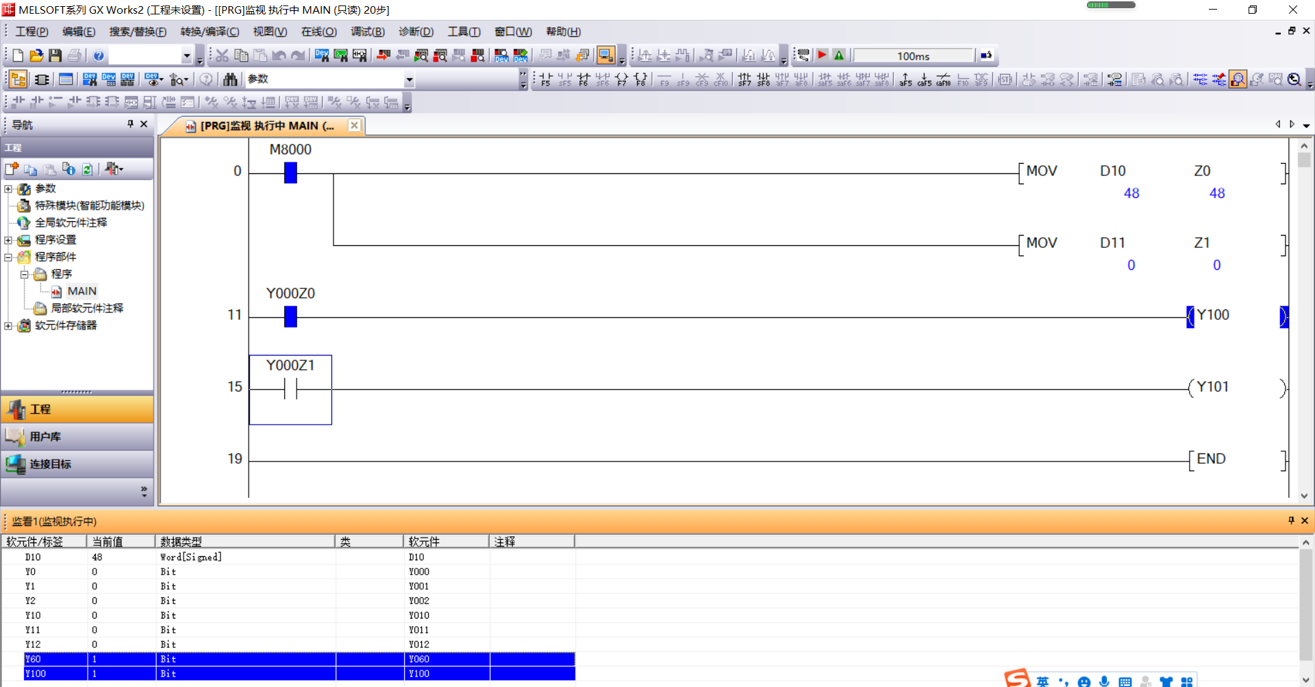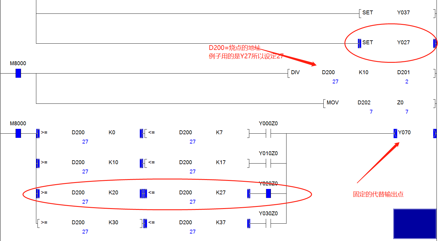 可以采用變址尋址方式實現,三菱FX3U,觸摸屏輸入需要替換的輸出點位置編號(由于輸出采用8位 方式,Y0-Y7,Y10-Y17,Y20-Y27,Y30-Y37,Y40-Y47,Y50-Y57,Y60-Y67對應0-7,8-15,...48-55,位置編號以此類推),如上圖,變址寄存器Z0,備用點為Y100,當D10=48時,Y60為1時,Y100為1,表示Y100跟Y60的輸出一致,及Y100是Y60的備用輸出點,當D10=0,Y100是Y0的備用輸出點,根據以上測試類推,可以配置多個備用點,需要注意的是每個備用點需要占用一個變址寄存器。具體變址的使用大家可以查手冊,希望這個測試對大家有所幫助。也歡迎大家來電討論!
