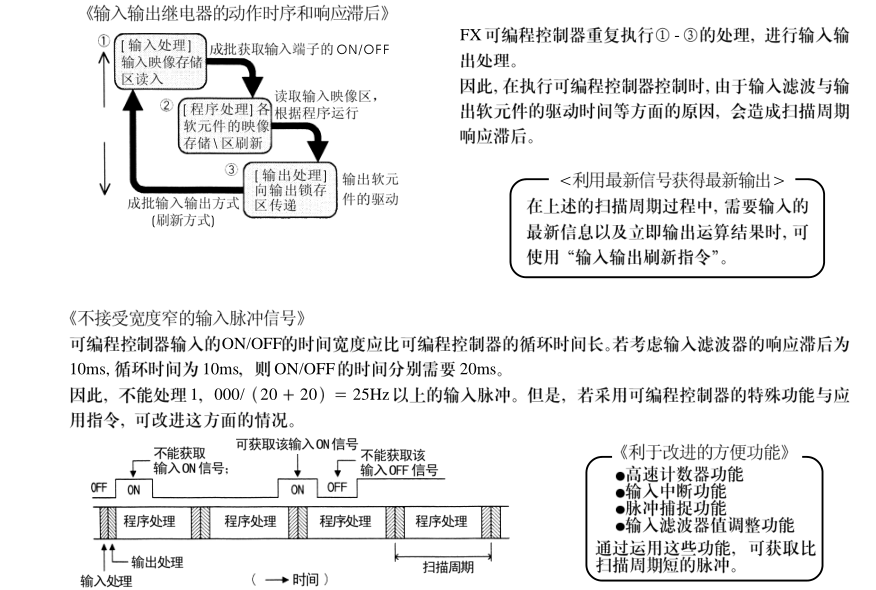 記得編程手冊對程序執(zhí)行方式和輸入輸出滯后是有說明的,特地翻了下,三菱1N2N的編程手冊有,F(xiàn)X3的就沒看到