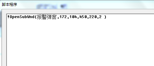 (1)!OpenSubWnd(窗口1,0,0,400,200,1)在位置(0,0)打開大小為400*200,子窗口名為“窗口1”的模態(tài)子窗口