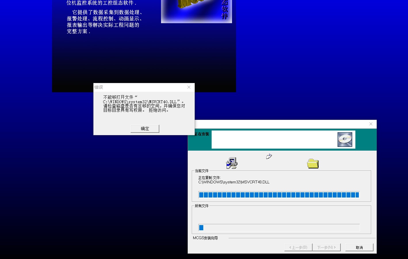 引用引用樓主張進(jìn)小子于2021-07-16 15:38發(fā)表的 關(guān)于MCGS安裝的求助 :大佬們,我這邊安裝昆侖組態(tài)的通用版一直出錯,如圖所示。我安裝嵌入版就沒問題,1.軟件官網(wǎng)下載的,2.管理員運行,3.我在C盤SYS文件中的MSVCRT.DELL文件全都取得管理權(quán)限,權(quán)限全都打開了。還是安裝不上。。。我系統(tǒng)是WIN10專業(yè)版的。。。崩潰