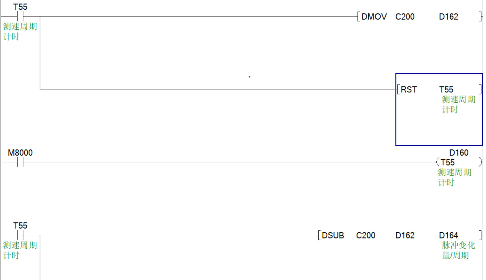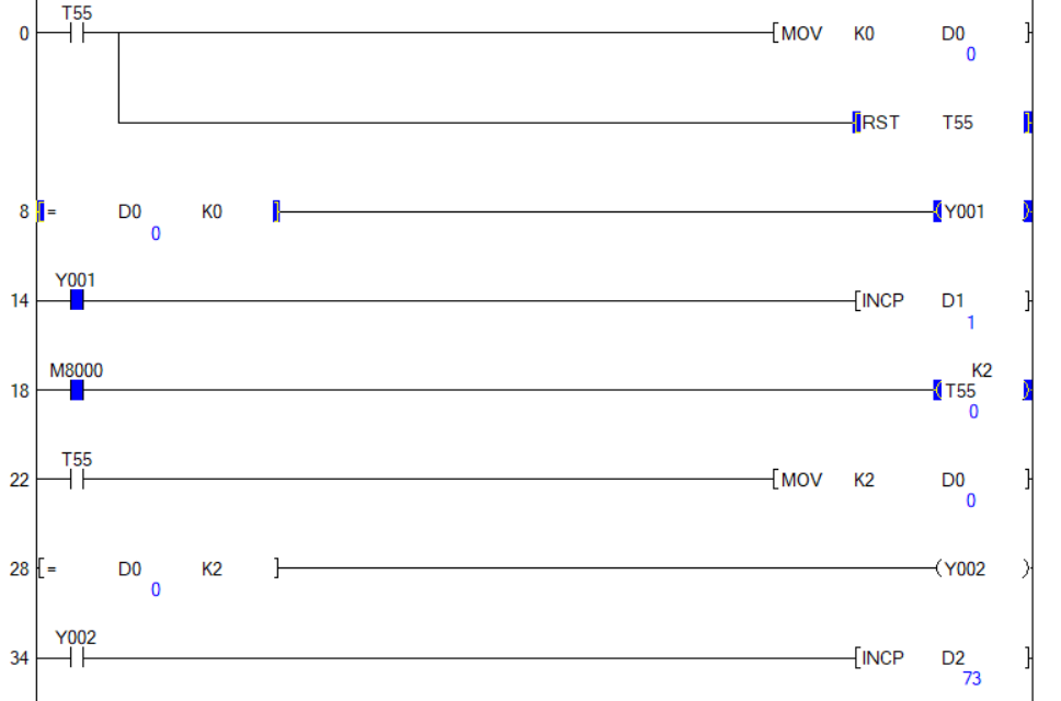 D164的值不確定,取決于T55觸點(diǎn)的被掃描時(shí)機(jī),因?yàn)镻LC中的定時(shí)器是異步掃描的,掃描第一個(gè)T55時(shí),如果定時(shí)時(shí)間沒有到,那么就不會(huì)執(zhí)行什么,當(dāng)掃描到第二個(gè)T55觸點(diǎn)時(shí),此時(shí)定時(shí)時(shí)間到,就會(huì)接通,從而這種狀態(tài)下D164會(huì)有值。