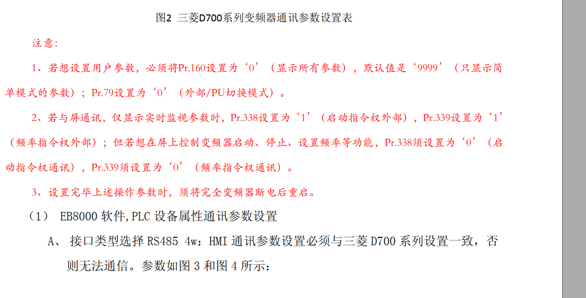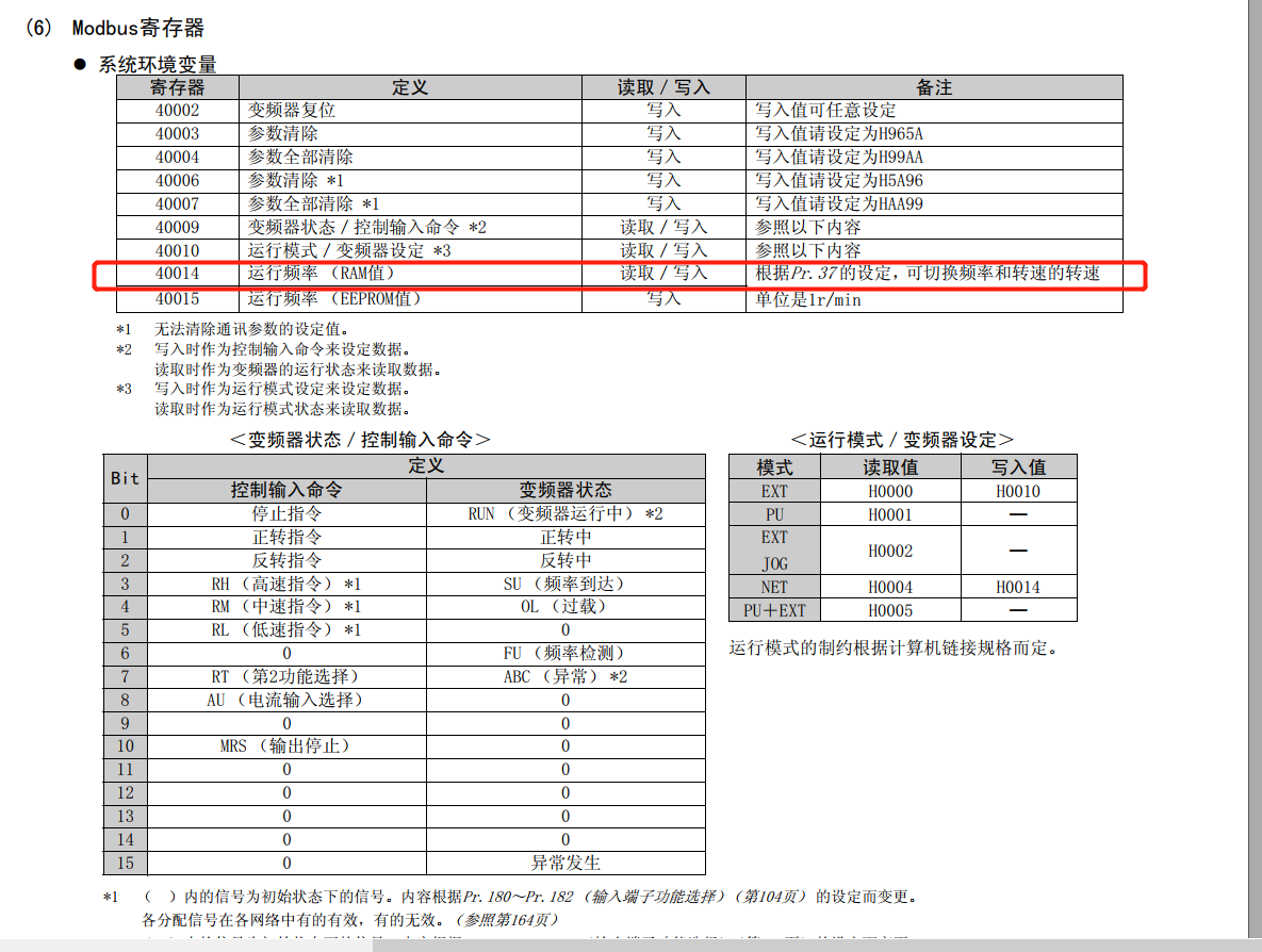 求救三菱FR-D720S變頻器通訊控制,現在已經和觸摸屏通訊上了,能監控到頻率電流,pr79從0到7設置了一遍無法從屏寫入頻率,pr338和pr339參數也都設置了一遍,也是不行,親問下各位高工還有哪里需要設置的嗎?看了頻率寫入地址是40014,而且我用的是威綸通官方的實例程序,40014對應6x14.,折騰兩天了,是在沒辦法了