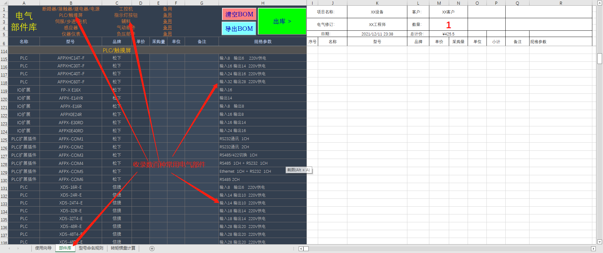 本人基于Excel開(kāi)發(fā)的一個(gè)硬件選型一鍵出BOM的工具,麻雀雖小五臟俱全,里面收錄了幾百種常用的電氣元器件,可以一鍵硬件選型,一鍵生成BOM清單,BOM計(jì)價(jià) 伺服步進(jìn)電機(jī)轉(zhuǎn)矩慣量計(jì)算,等方便實(shí)用功能,選型出BOM事半功倍,強(qiáng)烈推薦