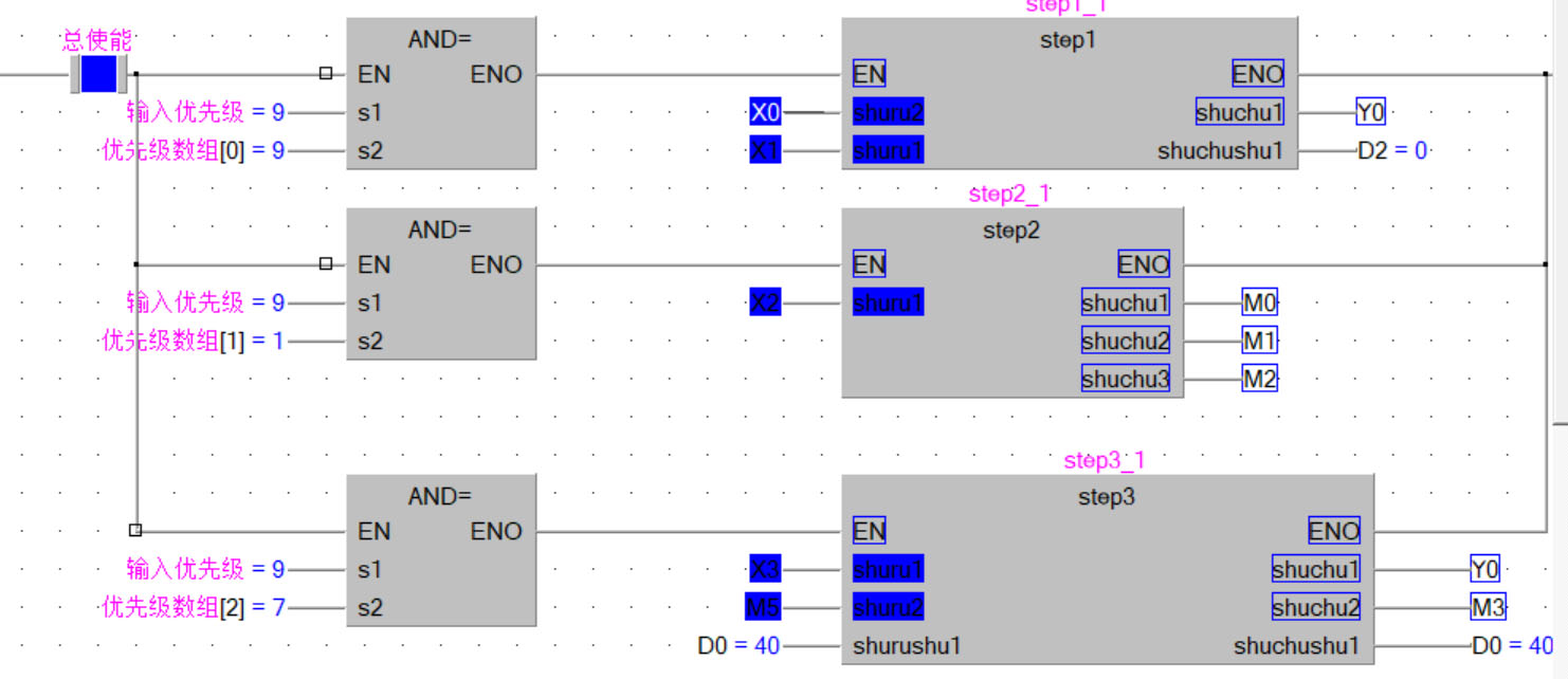 根據高人們的建議做了一個多工位的程序,step1   step2    step3  就是隨便做了3個工位的動作,all_run就是處理一下各工位的優先級(包括對各工位的優先級單元賦值、根據優先級確定執行那個工位),主程序就負責初始化,循環執行工位,在主程序POU_01中采用while的方式循環執行,在循環體內根據每個工位執行完后觸發的ENO信號,啟動下一個工位的動作。現在的問題是:程序無法仿真,有錯誤。請高人指點。謝謝