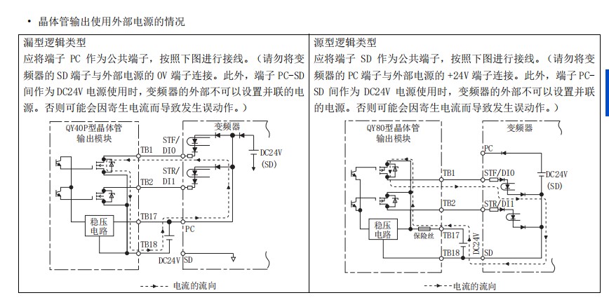 變頻器啟動不用SD與STF或SD與STR時,想用PLC的Y輸出(漏型輸出)直接輸出控制,怎么接線?是不是PC接+24V,Y輸出接STF、STR?但說明書里又寫著不能接輸入電壓(如圖1)。圖2的這個圖PC又是接了+24V的,所以我搞糊涂了,求用過的人,指教一下。
