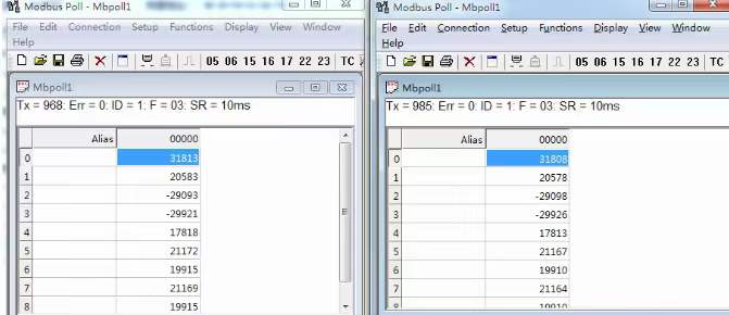 通過標準Modbus客戶端進行通訊測試,同時采集2臺PLC的數據,IP:192.168.1.188,通過端口502和503區分