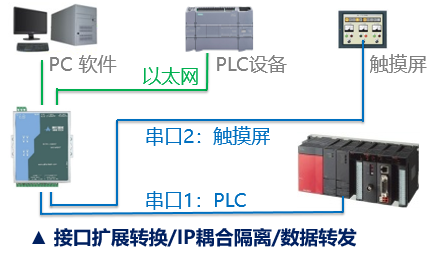 PLC的串口擴展轉換網口+串口,上位機與觸摸屏通過同一串口同時與PLC通訊;