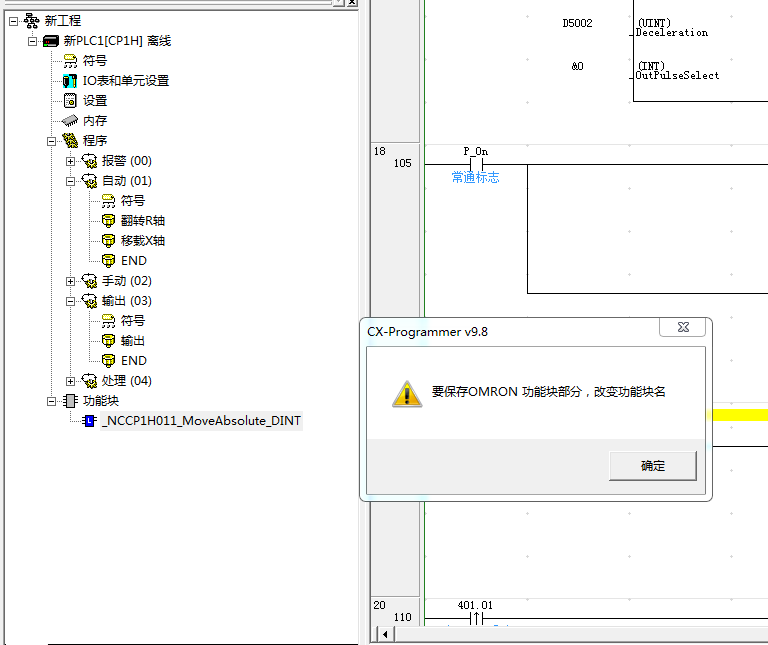 各位大神,菜鳥初學歐姆龍PLC在將程序內部使用的""功能塊保存為文件""時彈出"要保存OMRON功能塊部分,改變功能塊名",點擊確定后就沒反應了......還請指導一下怎么解決,十分感謝!