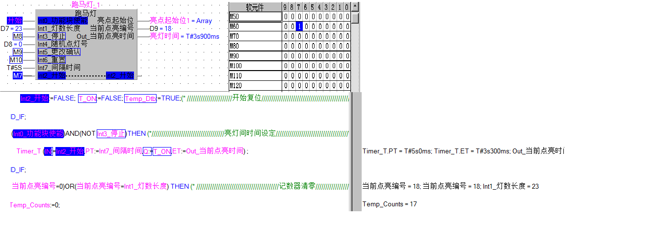 IF (Int0_功能塊使能)AND(Int1_燈數長度>0) AND(NOT Int3_停止)AND (LDP(1,T_ON))AND(當前點亮編號<Int1_燈數長度) AND(NOT Int6_重置) THEN