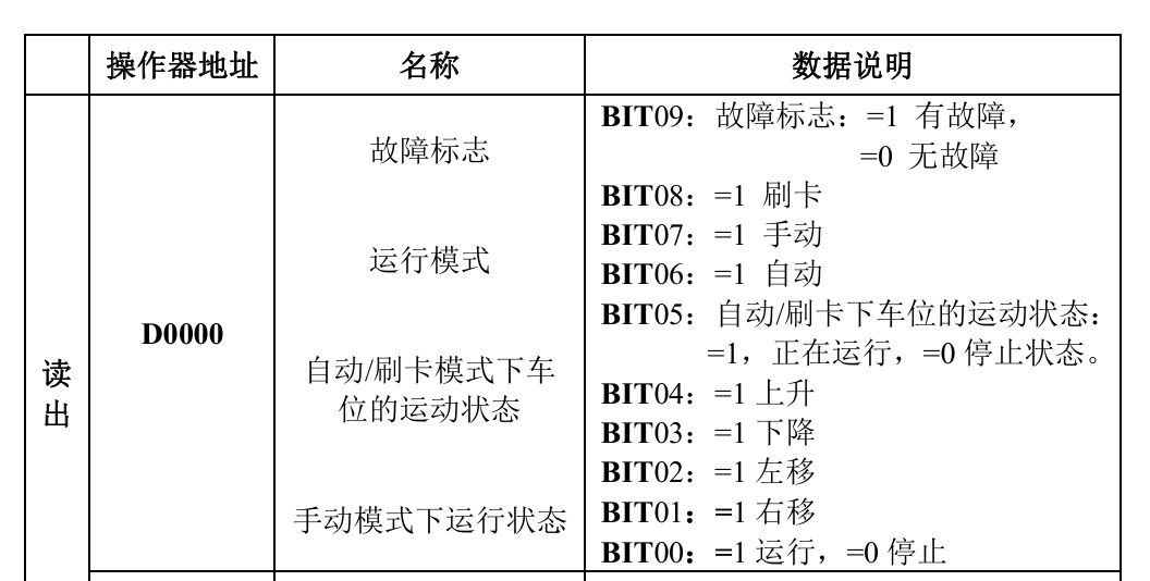 這個不用什么指令,可以直接表示 如下: D0.00 {=1 運行 / =0停止}......D0.09 {=1有故障  / =0無故障}
