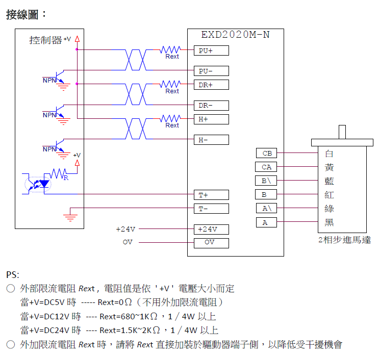因光電耦合器  如果直接接 24V 就很容易燒壞 步進馬達驅(qū)動器內(nèi) 方向的光電耦合器  你看一下 附圖 就會發(fā)現(xiàn) 附圖下面說若24V Rext 要接 1.5k~2kohm 電阻  若不如此做  方向的光電耦合器 LED很容易燒壞  若5V 就不需要  你查一下你的步進馬達驅(qū)動器的說明書看一下喔