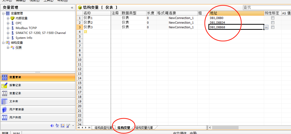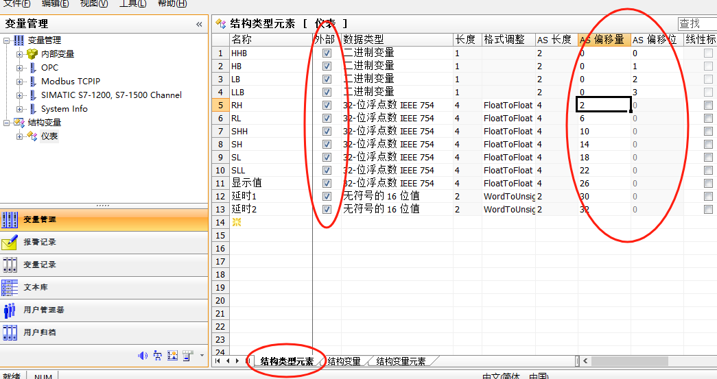 第四步,在WinCC的結構變量下新加一個結構類型,命名為“儀表”。然后選擇這個結構類型,添加結構類型元素。如圖所示,注意畫紅框地方的設置。