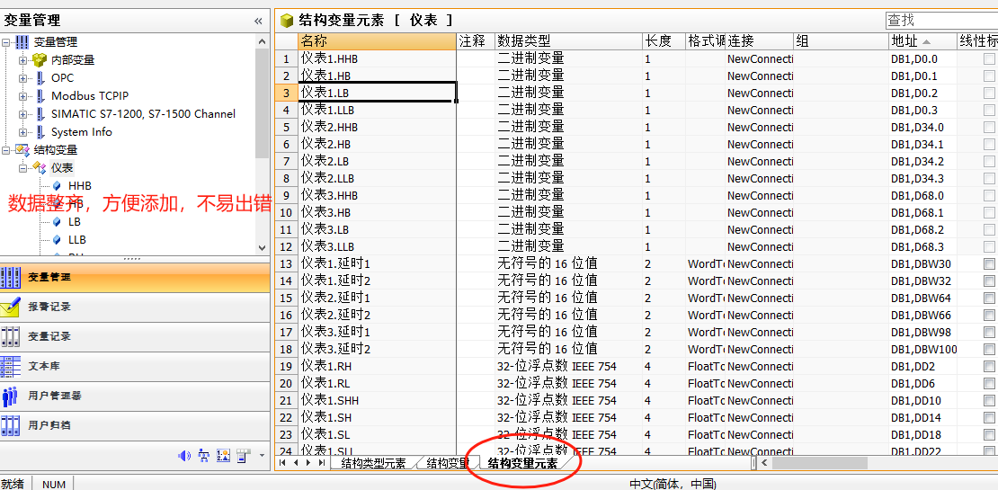 先看把這些變量傳到WinCC之后的效果,數據整齊,批量添加,不易出錯。更加方便之后的畫面組態。