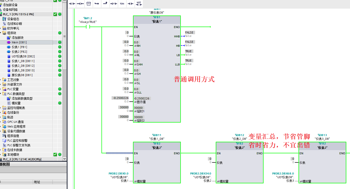 第三步,我們用原先的FB和用了UDT管腳的FB分別調用一下看一眼效果。程序功能還是一樣的,但是管腳數量大大減少,開發效率肯定是有所提升。