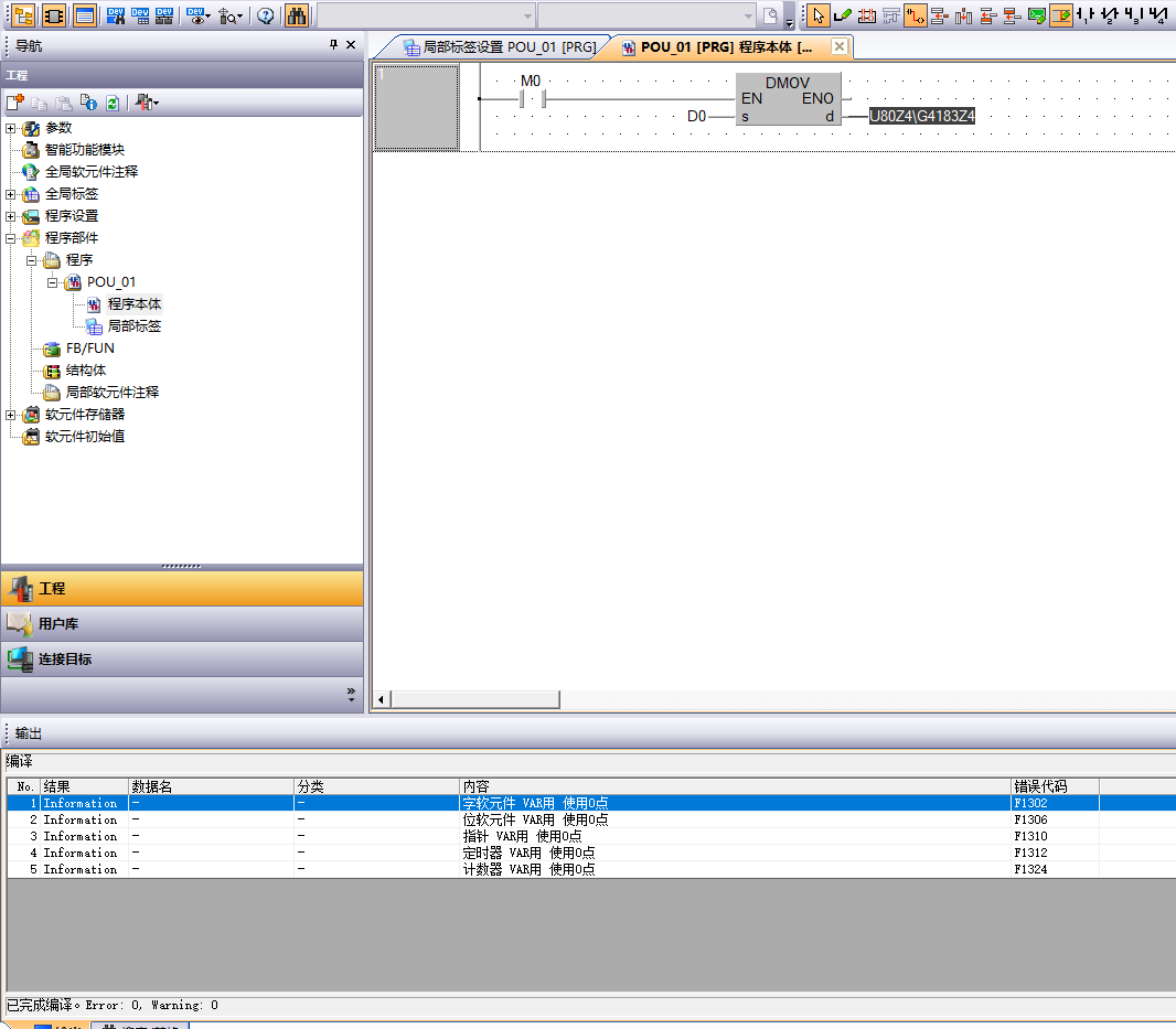最近剛接觸FBD編程,但發現Works2軟件讓人很懵逼,同一個程序,有時候報錯,有時候沒錯。 現在報錯“未定義函數DMOV/MOV”,有點無語了,難道要我去寫這兩個指令的的底層代碼嗎,太扯了。想問問到大佬們,這是哪里出問題了,是指令不對,標簽不對,還是編程軟件有問題,系統庫有問題