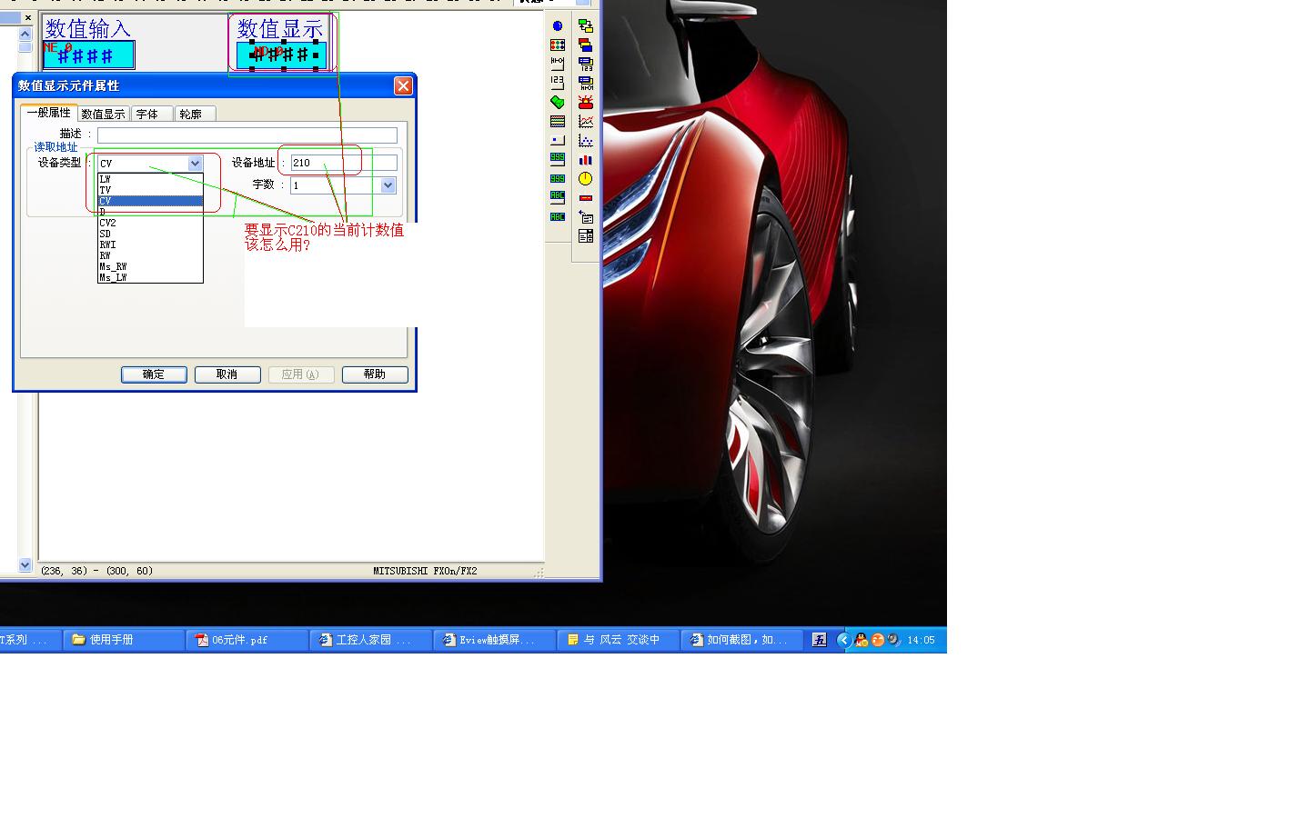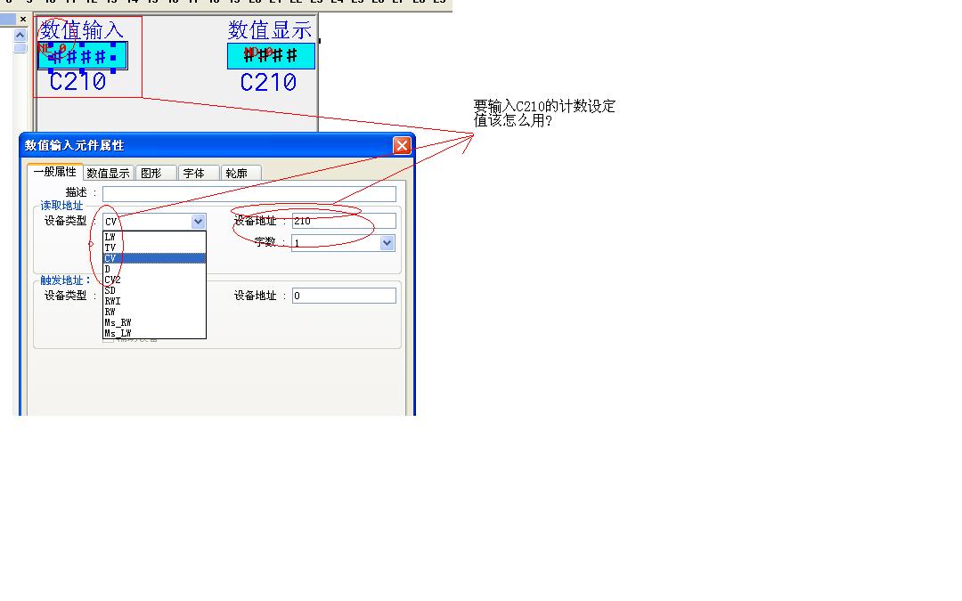 我想用ev屏輸入和顯示計數器C210的值,但ev屏里只有<CV TV CV2 SD>我該怎么用?[PLC三菱F1N]
