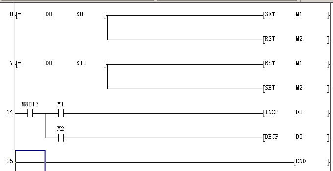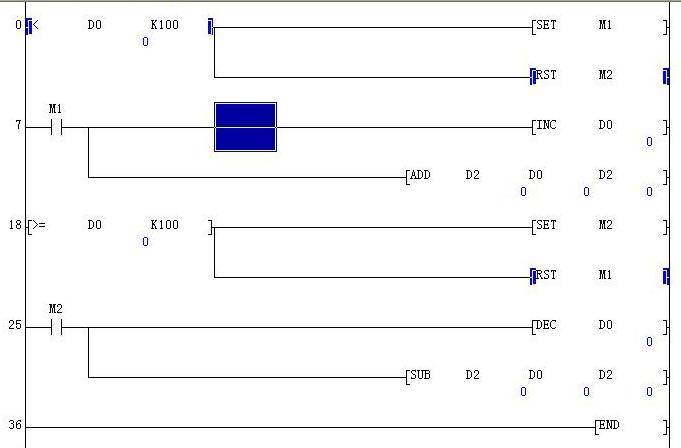 如此循環(huán),直到D0=100,復位M1,置位M2,假設(shè)此時D2=x(具體等于多少先不追究)