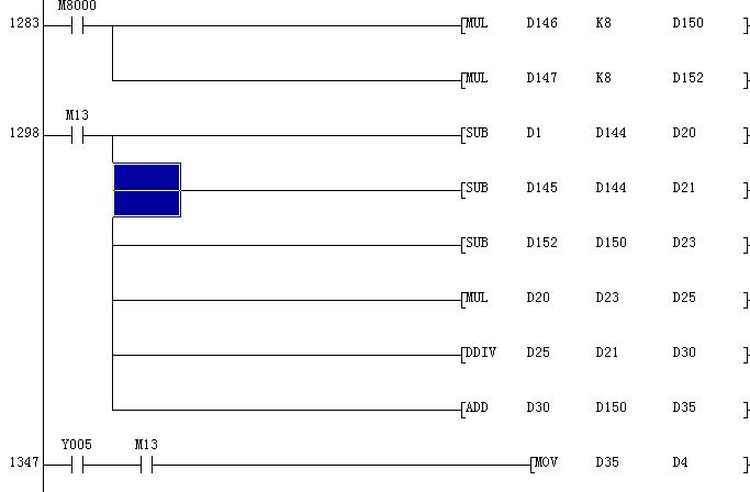 經(jīng)過(guò)第一行,第二行的乘法后,D150和D152是32位的,那么第五行的SUB怎么可以用16位的,指令手冊(cè)上不是寫了兩個(gè)32位的相減用DSUB嗎?