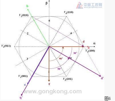 d、q軸矢量與a、b、c軸或α、β軸之間的角度的關系如下圖所示,棕色線d軸與a軸或α軸對齊,即直接對齊到電角度0點,紫色線為d‘軸與a軸或α軸相差30度,即對齊到-30度電角度點: