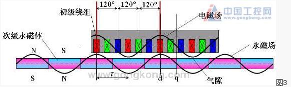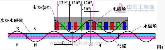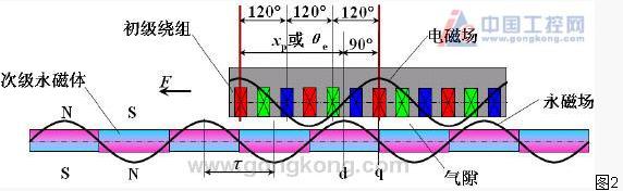 在實際操作中,歐美廠商習慣于采用給電機的繞組通以小于額定電流的直流電流使電機轉(zhuǎn)子定向的方法來對齊編碼器和轉(zhuǎn)子磁極的相位。當電機的繞組通入小于額定電流的直流電流時,在無外力條件下,初級電磁場與磁極永磁場相互作用,會相互吸引并定位至互差0度相位的平衡位置上,如下圖所示: