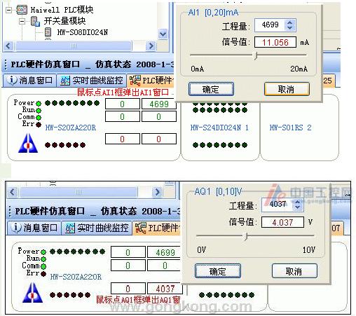 在仿真狀態下,可以通過仿真窗口或強制窗口輸入AI/AQ值,在仿真窗口輸入AI/AQ值時還可以直接得出輸入/輸出的信號量值。如下圖: