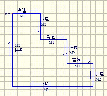 例如它在M2低速這段路程的某一點被按下停止它會按前進的速度和路線返回原點停止,它在啟動時就要以高速返回M2這段路程被按下停止是的這一點,然后接著低速工進!
