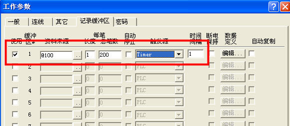 Step1:應用》》設置工作參數》》記錄緩沖區,如果你僅僅要采集D0的話,選擇長度為1,總筆數無關緊要,但是你要做查詢的話,就應該設置你需要的總筆數,比如你要查詢50筆記錄,那么就設定50.