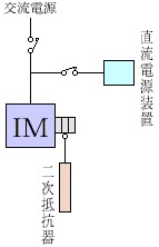 直流電動機の入力端子を開放した狀態で手で回すと、電動機の軸は簡単に回ります。しかし、入力端子を短絡させて手で回すと、回転によって電気エネルギが発生し、制動力が生じて容易には回転しません。ダイナミックブレーキ制御は、これの原理を利用したものです。巻線形三相誘導電動機の一次側の交流電源を切り離し、その一次側に直流発電機で発電した直流を流します。すると、回転子巻線に直流勵磁が加わり、電磁石として作用するため、制動力を得ることができます。この方式は、全速の10%~70%程度の低速を任意に得ることができますが、制動力が大きいために、負荷が軽い場合は低速での巻下げが行なえません。そのため、電動機容量110kW以上の大型電動機や質量の大きな作業を行なうレードルクレーン等に利用されています。
