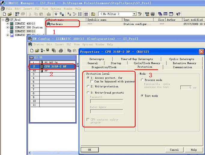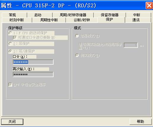 按照1.HardWare  2.CPU Property   3.Protection的順序找到保護設(shè)置頁,保護等級設(shè)置為“1 ”,然后保存,再下載到PLC中。