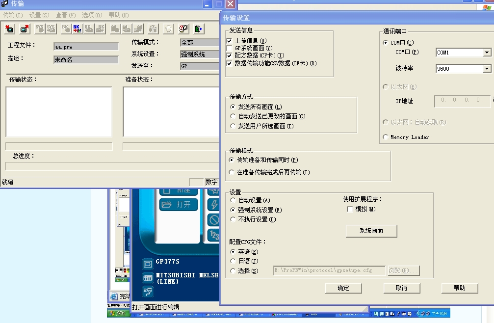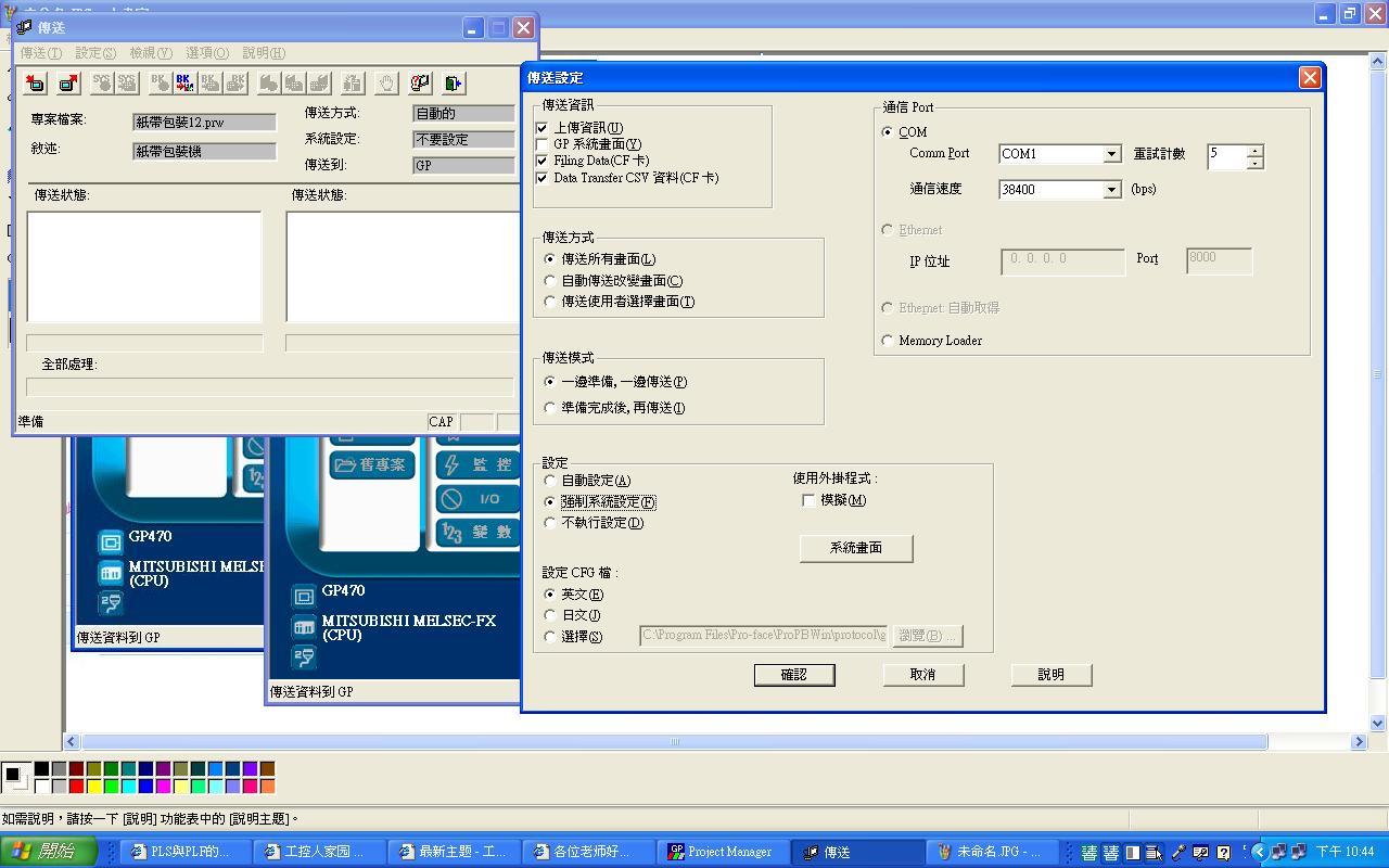 空的也可以下載,但一般你可以規劃個按鈕跟指示燈這就是最基本的看是否正常,沒有也沒關係,傳輸埠要用插在tool埠,就那一個跟三菱fx系列傳輸不一樣的那一個8 pin din接頭,但傳輸線可能無法自製或用其他的替代一定要用proface自己的傳輸線.有的型號直接就可傳輸有的就要跳入人機本身的系統畫面才開始做傳輸.